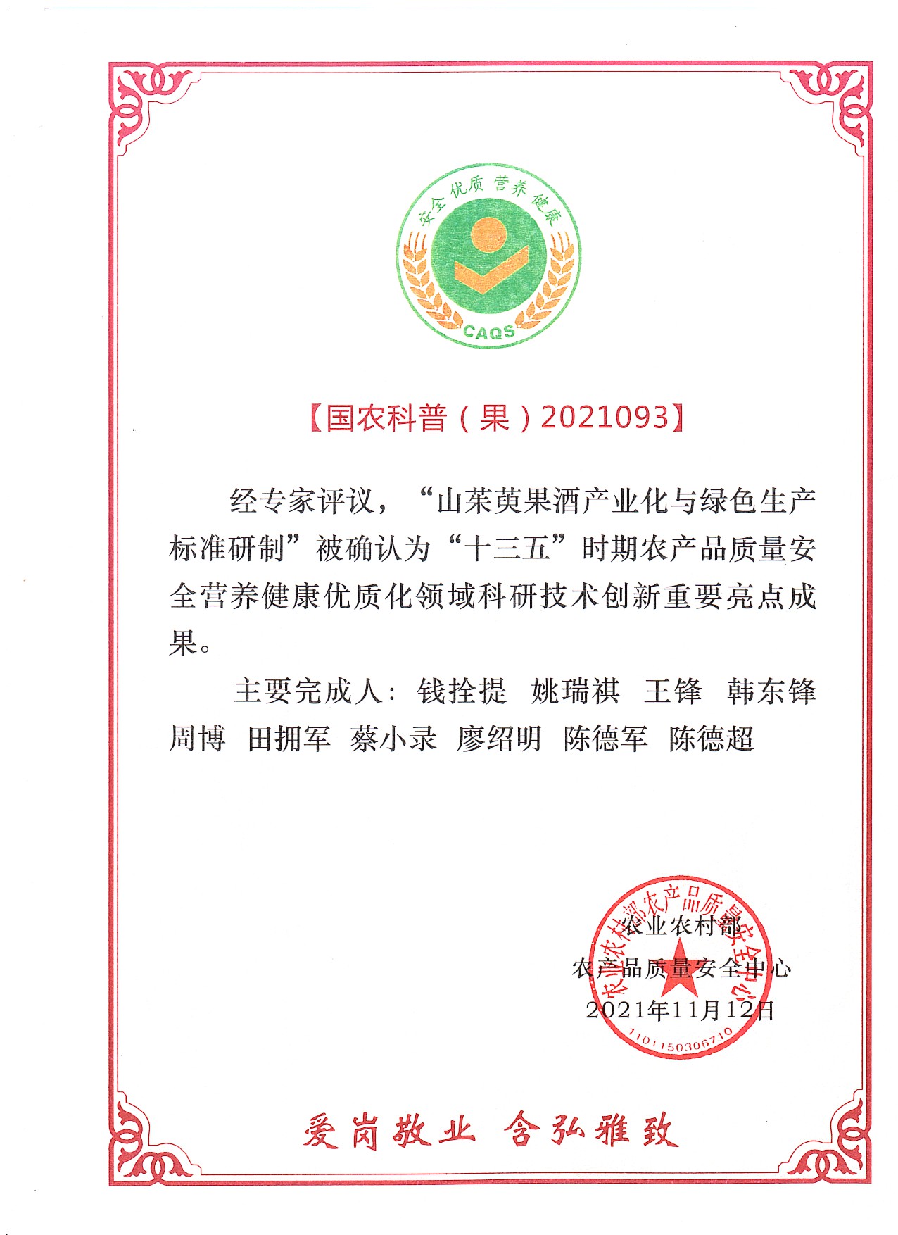 今年3月,农业农村部农产品质量安全中心在全国范围内征集“十三五”时期完成的农产品质量安全优质化与品质营养健康领域科研成果,我校山茱萸产业研发中心积极响应,经推荐、专家审查评议并最终入选。