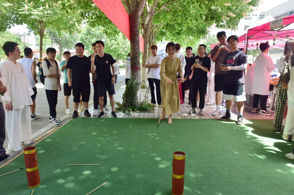 药物工程学院在西、南校区举行了“正禾”育人工程之“传播非遗文化 迎端午 送健康”主题活动。活动主要包含八段锦表演、汉服舞蹈、做香包、传统手工制做山楂丸、投壶、中医药文化宣传和中医药养生科普知识资料发放等。活动现场,汉服爱好者穿上华美汉服,展现中华传统服饰之美。中医药专业的学子在香包内放入自己炮制、研磨、制作的中药材,外观精美,气味幽香,深受现场师生的欢迎。为了赢得精美香包,大家踊跃参加投壶比赛,现场体验了一把“穿越”的乐趣。