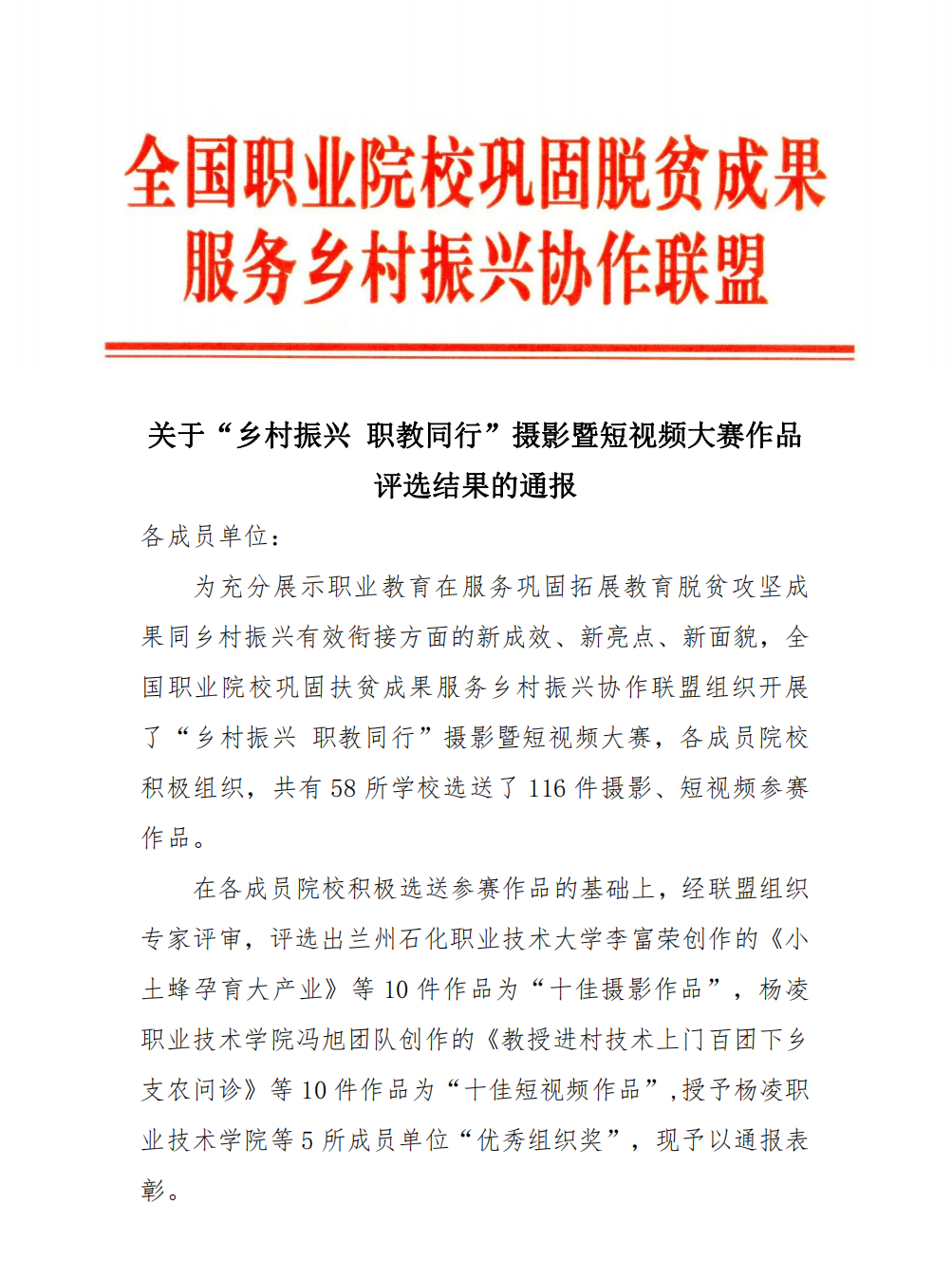 11月13日,全国职业院校巩固扶贫成果服务乡村振兴协作联盟公布了“乡村振兴 职教同行”摄影暨短视频大赛作品评选结果,冯旭团队创作的短视频《教授进村技术上门百团下乡支农问诊》获得“十佳短视频作品”,我校获优秀组织奖。获奖作品将通过联盟公众号和网站宣传推介并向全国主流媒体和上级部门重点宣传推介。