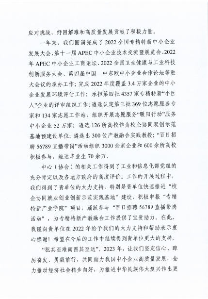 1月17日,新春佳节来临之际,工业和信息化部中小企业发展促进中心向我校发来感谢信,对我校在2022年给他们的支持和帮助表示衷心感谢,并希望在今后的工作中继续得到我校更大的支持。