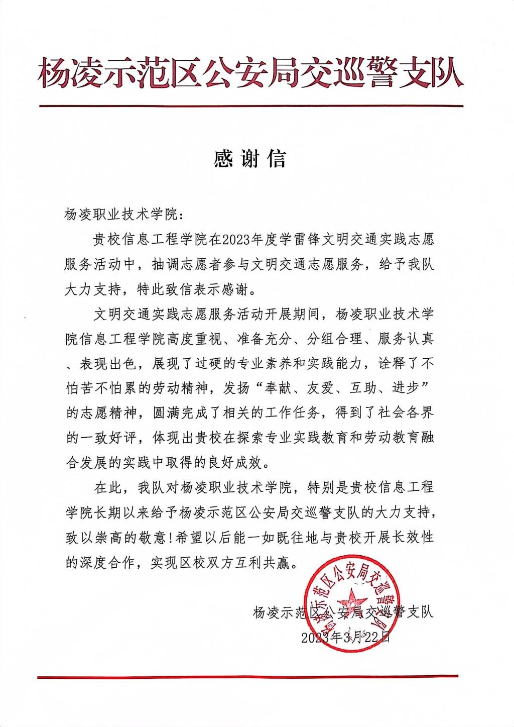 活动期间,杨凌示范区公安局交巡警支队向我校发来了感谢信,对我校表示感谢,对志愿者出色的表现进行了表扬,并希望能一如既往地开展长效性的深度合作,实现区校双方互利共赢。志愿者们纷纷表示,将进一步传递文明交通正能量,发挥好新时代志愿者的示范引领作用,大力发扬“奉献、友爱、互助、进步”的志愿精神,在传承雷锋精神中展现杨职青年担当,贡献杨职青年力量。