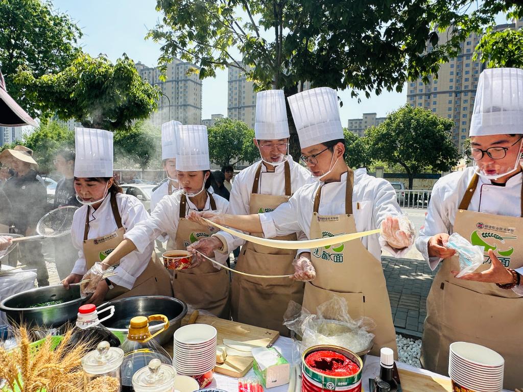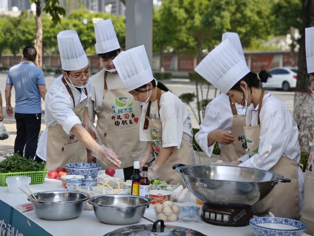 品鉴活动设置科技创新体验组国际合作体验组乡村振兴体验组示范推广体验组等四个组别,参赛选手中有高校师生、有社区居民、有蘸水面商家杨职代表队参加的是示范推广体验组活动中,我校师生把一块块面团,通过揉、擀、扯、甩的手法,加工成又宽又长、又薄又劲道的面条大家配合默契、技术到位、分工明确,完美展现了我校学生的风采。