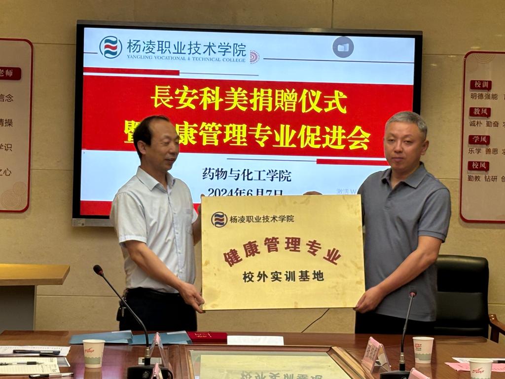 6月7日,长安科美有限公司捐赠仪式暨健康管理专业促进会在药物与化工学院天择楼召开。长安科美董事长龙俊宏、药物与化工学院负责人及教师代表等人参加会议。