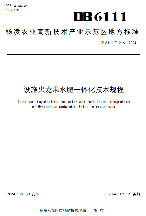 近日,学校为第一起草单位主编的3项火龙果地方标准获批发布,分别为《设施火龙果水肥一体化技术规程》(DB6111/T 216-2024)《设施火龙果产期调控技术规程》(DB6111/T  215-2024)《火龙果保险技术规程》(DB6111/T 217-2024),将于2024年9月21日起正式实施。
