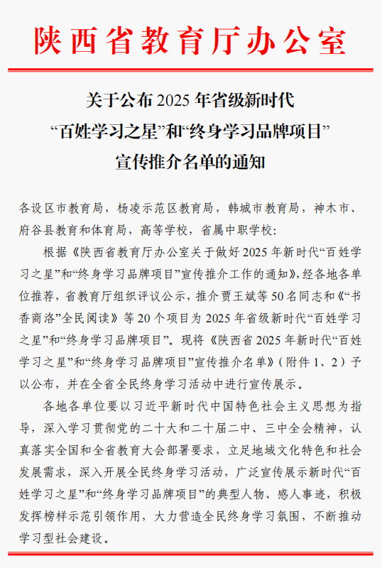 近日,省教育厅公布了2025年省级新时代“终身学习品牌项目”宣传推介名单,我校《发扬种子精神 根植旱区大地塑造“三农”大情怀》项目入选2025年全省新时代“终身学习品牌项目”。