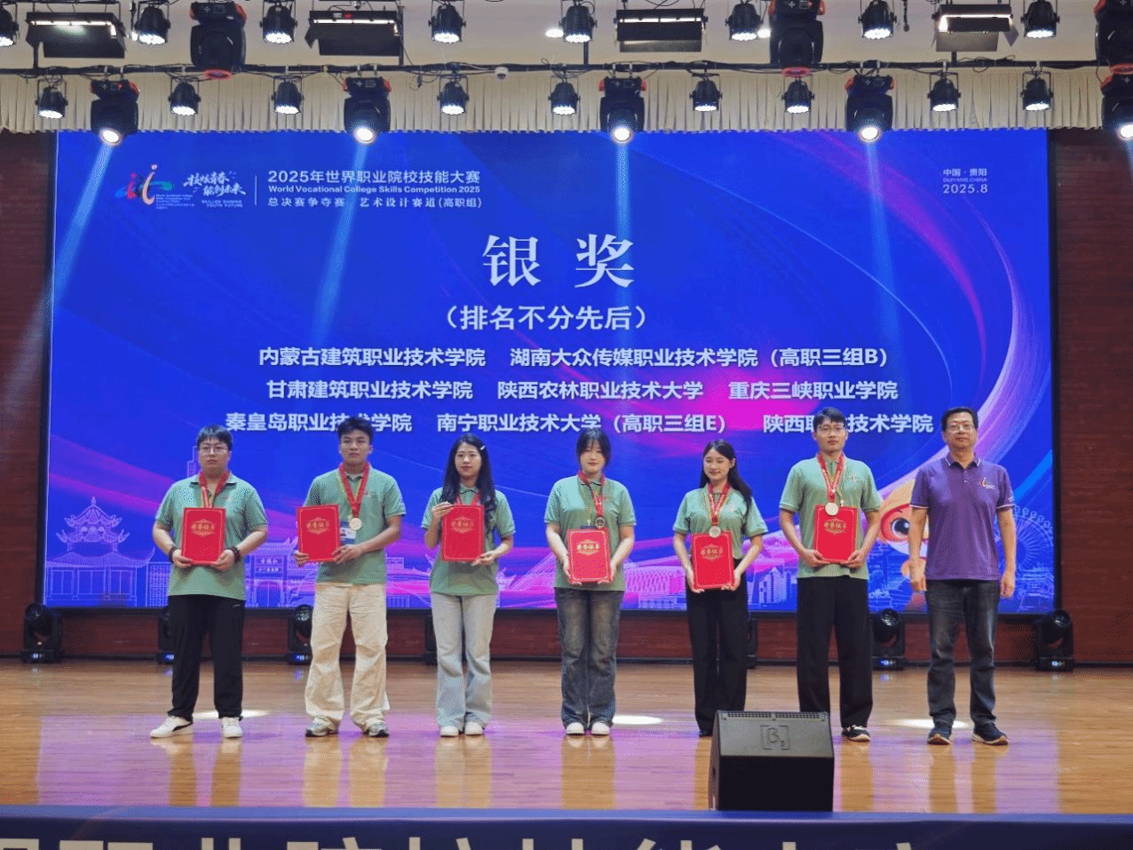 8月24日至31日,2025年世界职业院校技能大赛总决赛争夺赛艺术设计赛道在贵州电子商务职业技术学院成功举办,共有来自全国省、自治区、直辖市的200支队伍参赛。我校生态环境工程学院由教师李军科、张美妮指导,张少华、张舒涵、魏琦娴和王佳鑫组成的学生团队,凭借扎实的专业技能,荣获银奖。