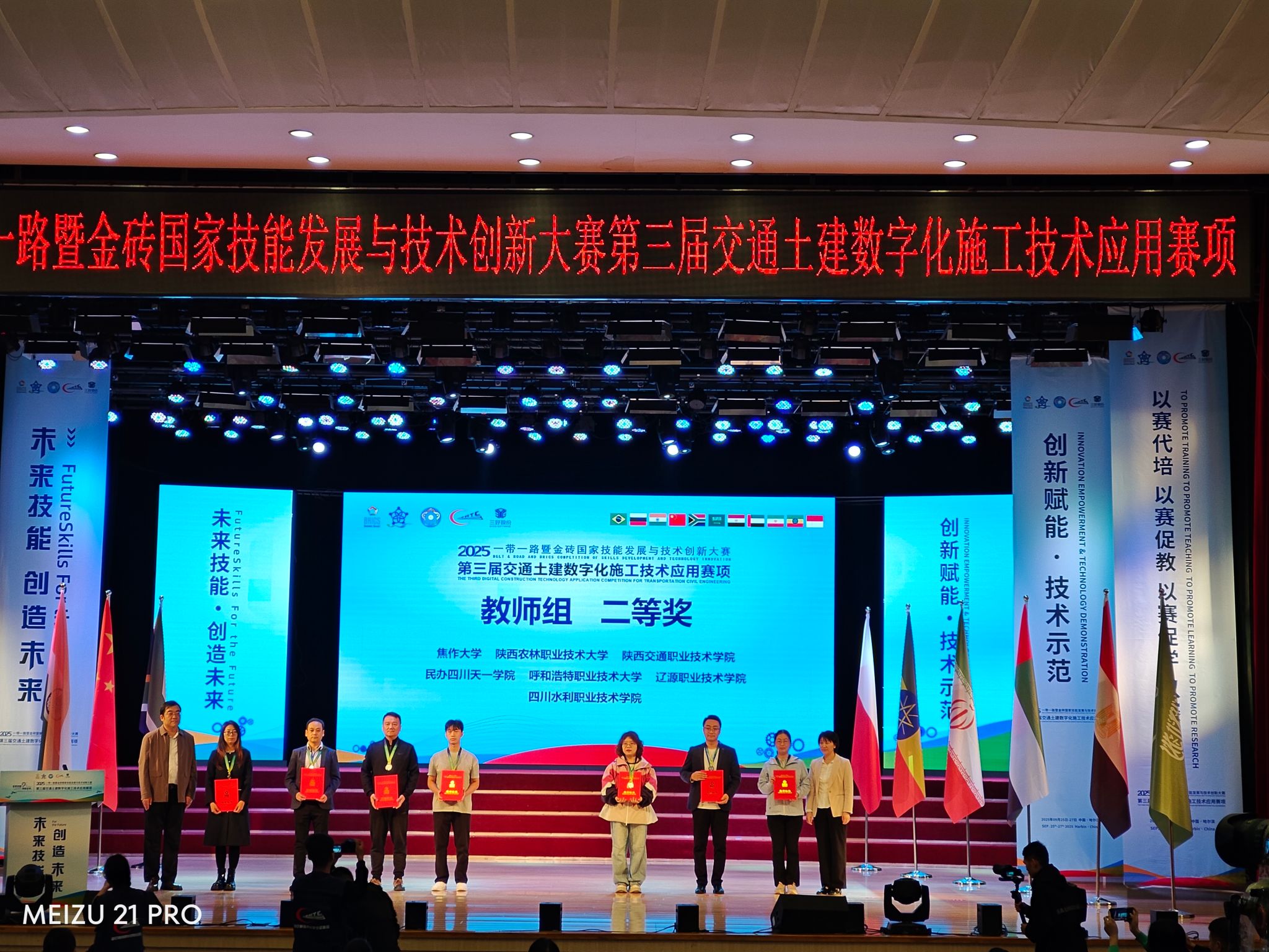9月25日至27日,2025一带一路暨金砖国家技能发展与技术创新大赛第三届交通土建数字化施工技术应用赛项全国总决赛在哈尔滨铁道职业技术学院成功举办。本次大赛以“未来技能・创造未来”为主题,吸引了全国141所院校253支队伍同台竞技。经过激烈角逐,我校交通与测绘工程学院道路与桥梁工程技术专业董雄辉、黄家豪两名同学获得高职组一等奖,教师穆江飞获教师组二等奖,学校获最佳组织奖、优秀组织奖,指导教师穆江飞和吴彩星获优秀指导教师。