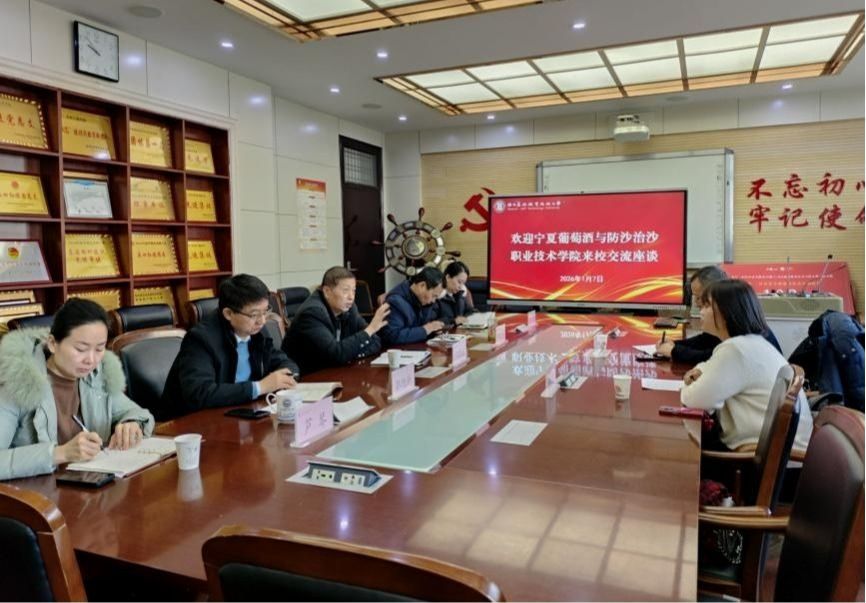 1月7日上午,宁夏葡萄酒与防沙治沙职业技术学院副院长江志国、水利工程系主任蔡莎一行来校考察交流。副校长祝战斌、水利工程学院负责人及相关教师参加。