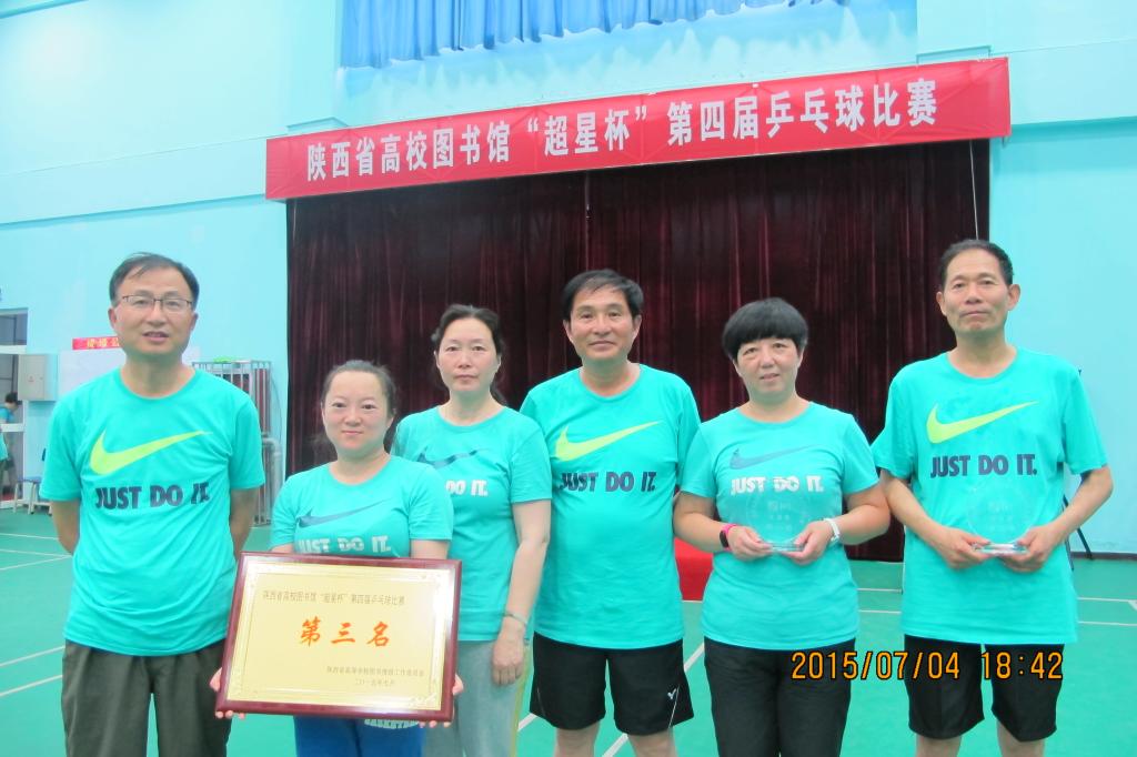 7月4日,陕西省高校图书馆“超星杯”第四届乒乓球比赛暨馆领导乒乓球友谊赛落下帷幕,我院图书与信息中心荣获团体第三名,成全之同志获男子单打第五名,吴小凤同志获女子单打第八名。