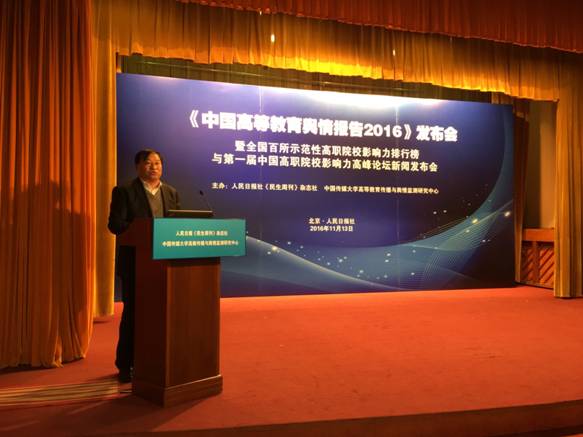 11月13日上午,“2016中国高等教育舆情报告发布会暨全国百所示范性高职院校影响力排行榜与第一届中国高职院校影响力高峰论坛新闻发布会”在人民日报社举行,我院院长王周锁应邀参加了本次新闻发布会。