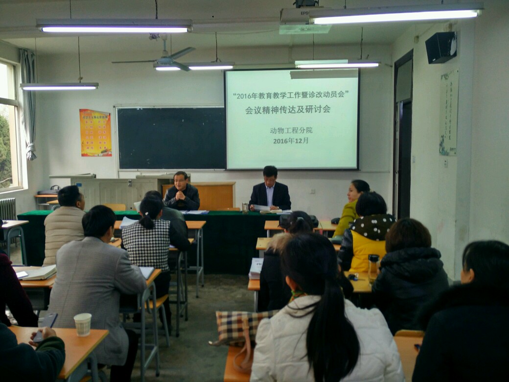 动物工程分院:12月2日,动物工程分院在林和楼229教室召开了分院党政领导和全体教职工会议,传达了2016年教育教学工作暨诊改动员会精神。会议由分院书记王秉信主持。通过学习和讨论,使广大教职工充分明晰了学院的发展战略目标,理解了学院内涵式发展的途径和抓手,统一了“夯基垒台,立柱架梁”的战略思想,坚定了建设一流高职名校的决心;清晰认识了内部质量保证体系诊断与改进工作的相关背景与要求,理解了我院诊改工作的基本思路,目标任务和总体安排,为下一步有效开展诊改工作奠定了基础。与会教职工围绕学院三位领导的报告和讲话,结合分院实际教学工作,广开言路,建言献策,并纷纷结合自己工作就分院专业建设、课程建设、招生就业、实训条件建设和师资队伍建设等方面展开热烈讨论,提出很多建设性提意见和建议。
