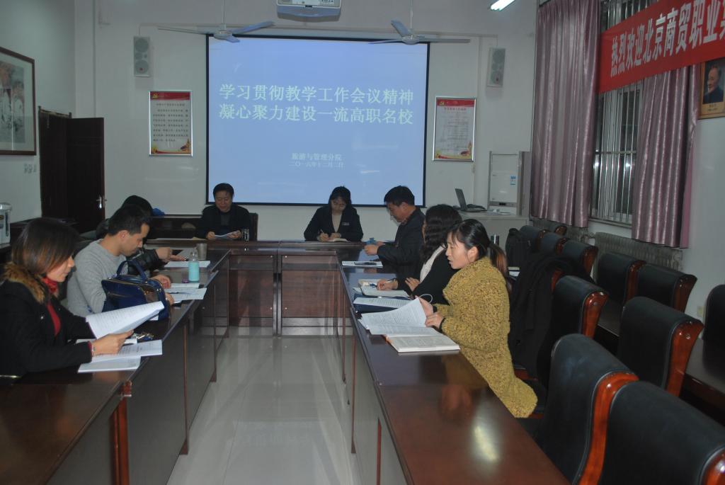 旅游与管理分院:12月2日下午,旅游与管理分院召开全体教职工大会,传达学习学院“2016年教育教学工作及诊改启动会”的会议精神。会议由分院副院长王青宁主持。会议要求全体教职工按照赵曼书记的要求,要切实把思想和行动统一到加快学院发展、建成一流高职名校这个总目标上来。每一位教职工都要认真领会、统一思想、统一认识,鼓足干劲,积极实施。会后,全体教职工按照分院党支部归属,分为两个讨论小组进行研讨,研讨会上,两个讨论小组畅所欲言。最后将研讨结果报分院办公室汇总。