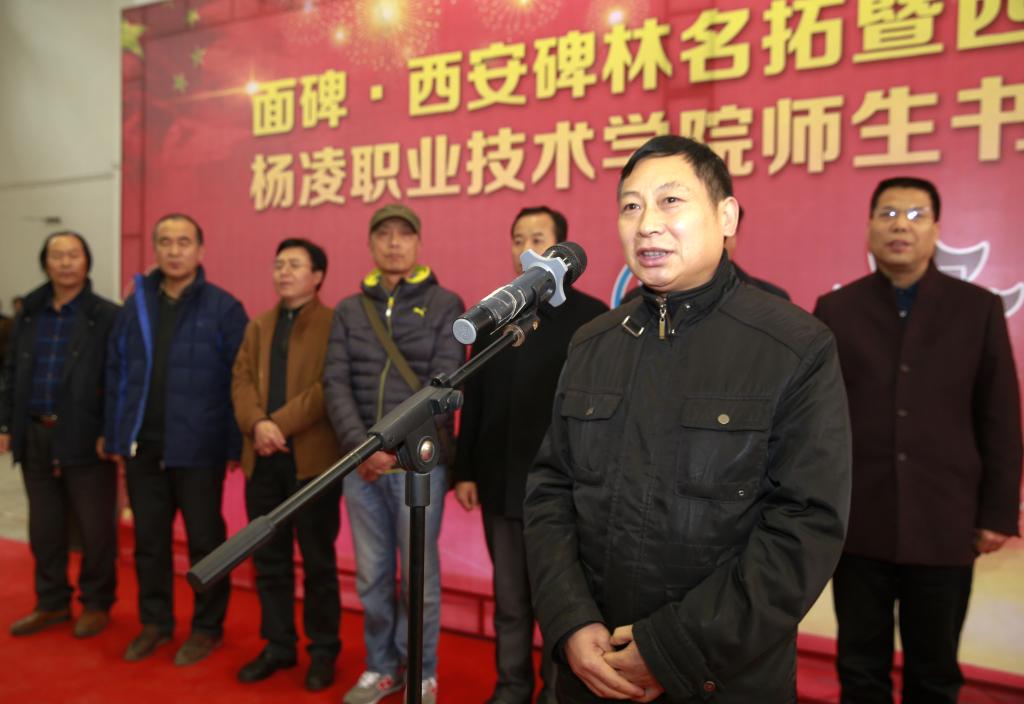 王冰在介绍展览基本情况时说到,西安碑林博物馆书法艺术中心自2011年3月成立以来,以“面碑”为主题的书法展,先后走进河南洛阳、信阳,湖北钟祥,陕西宝鸡、渭南、汉中、延安、深圳、拉萨以及韩国等地区和国家。此次《面碑•西安碑林名拓暨西安碑林书法家、杨凌职业技术学院师生书画摄影作品展》在杨凌展出,是“面碑”书法展的第20站。希望杨凌职业技术学院师生能够通过此次展览,实现与经典零距离,与名家面对面,感受传统文化的神奇魅力。同时,为师生们欣赏和学习书画摄影艺术提供有益的借鉴。