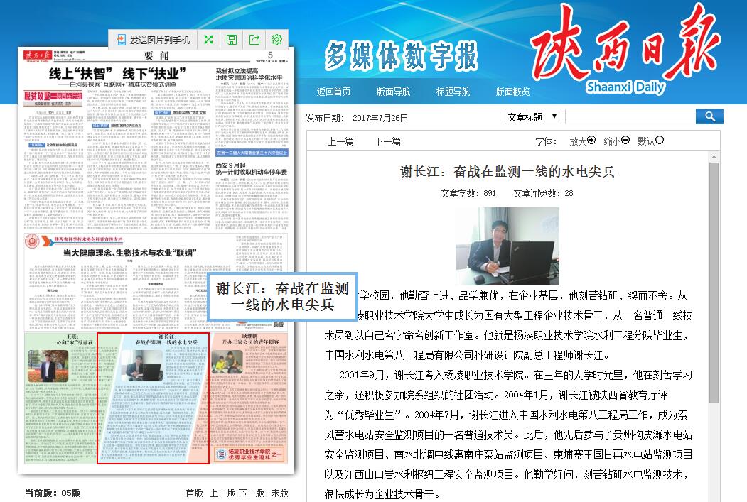 2016年10月,以他的名字命名的“谢长江创新工作室”在中国水利水电第八工程局有限公司成立。自此,这位由杨凌职业技术学院培养的优秀毕业生在实践中完成了蜕变,成为深受企业、行业认可的创新领军人才,成为扎根监测一线的水电尖兵。参加工作12年来,谢长江连续多年被评为优秀共产党员、技术管理先进工作者、安全生产先进个人,先后获得工会工作积极分子、优秀项目经理、先进工作者。他常说,是杨凌职业技术学院为他筑牢了专业基础的第一步,老师的教诲、同学的鼓励、浓厚的学习氛围和严谨的工作态度,让他受用一生。
