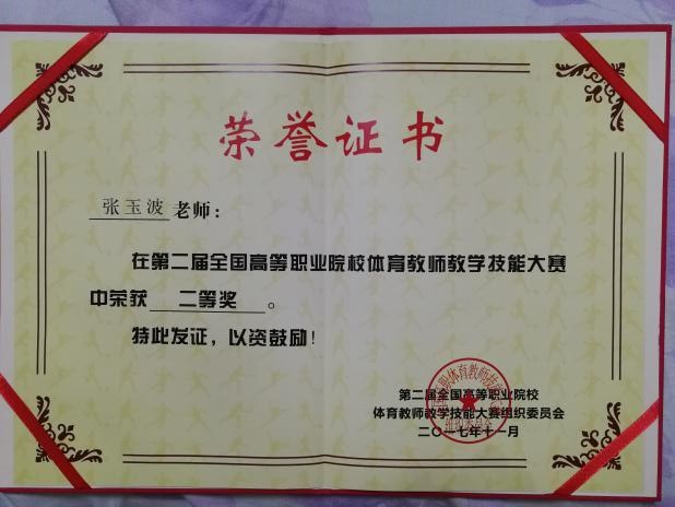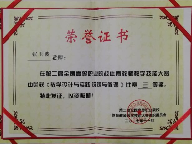 11月24日至26日,第二届全国高等职业院校体育教师技能大赛在苏州职业大学举行,共有来自全国各地的251名体育教师参加。我院教师张玉波作为陕西省代表队(共11人参加)的一员参加了本届大赛,并获得了本届教学技能大赛二等奖和教学设计与实践三等奖的好成绩。