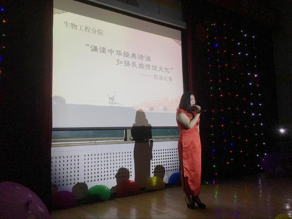12月20日晚,生物工程分院也举办了“ 诵读中华经典诗词,弘扬民族传统文化 ” 朗诵比赛,来自分院各个专业的8支队伍参加了比赛。比赛中,学生们 通过配乐、表演、舞蹈、书法等方式让朗诵的诗文更深入人心,引人入胜。