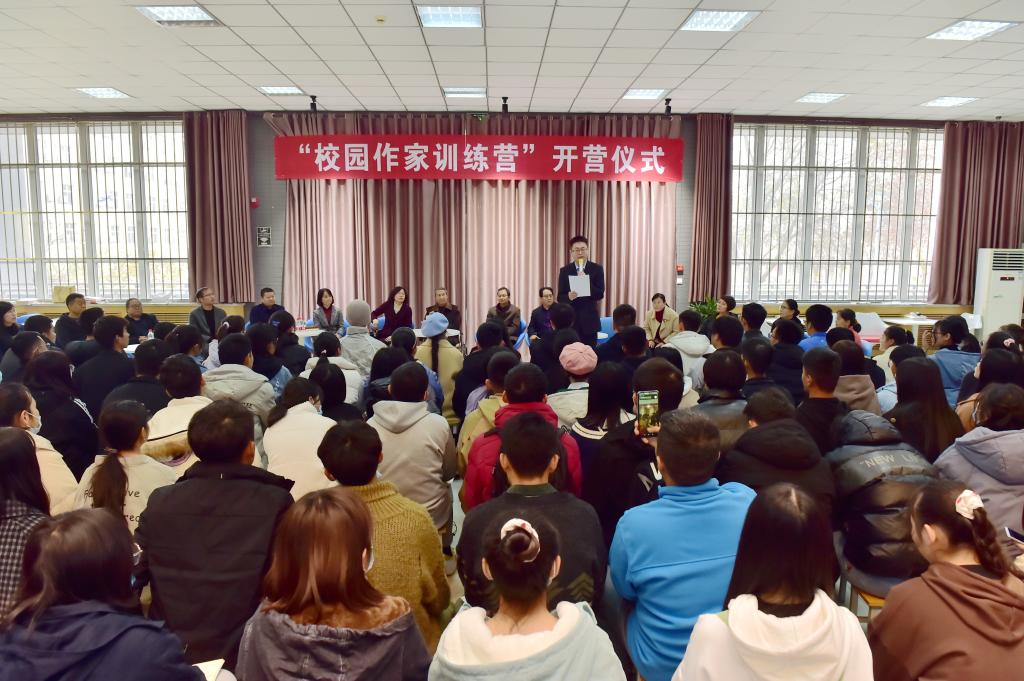 11月21日下午,我校“校园作家训练营”在西校区图书馆举行开营仪式。副校长祝战斌致辞,图书馆馆长王红相、文理分院院长王云江,中国作协、省作协十位作家,以及部分教师代表、团委《职苑文艺》编辑部、各二级学院文学社成员共300余人参加了开营仪式。仪式由学工部副部长、团委书记陈吼主持。