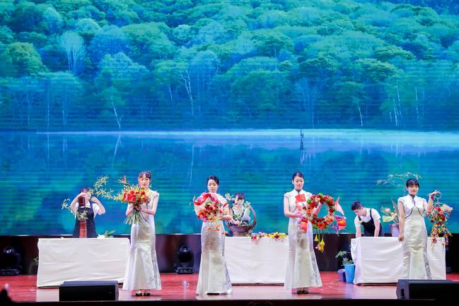 “红之华美逐梦百年”献礼建党100周年花艺技能展示项目由我校生态环境工程学院师生共同创作,分为现代花艺成品展示和中国传统插花现场创作两个部分。现代花艺系列作品由花环、伞花、手提花、手捧花组成创作中融入了中国红、党旗、党徽等元素,将爱党爱国之情融入花艺。中国传统插花技艺现场展示部分为筒花、篮花和缸花三部分。筒花,名为“筑梦求真”,以直立的竹筒表现我党在100年前建党,用平伸悬空的枝条表现中国共产党为探求真理而艰难探索的历程。篮花,名为“盛世繁花”,用绣球、百合等花材,多种花材丰富的色彩,表现人民生活的安康幸福。缸花,名为“国之栋梁”,用向日葵和直立向上的青竹,表达职业教育蓬勃发展,学生技能日益精湛,成就未来国家栋梁。