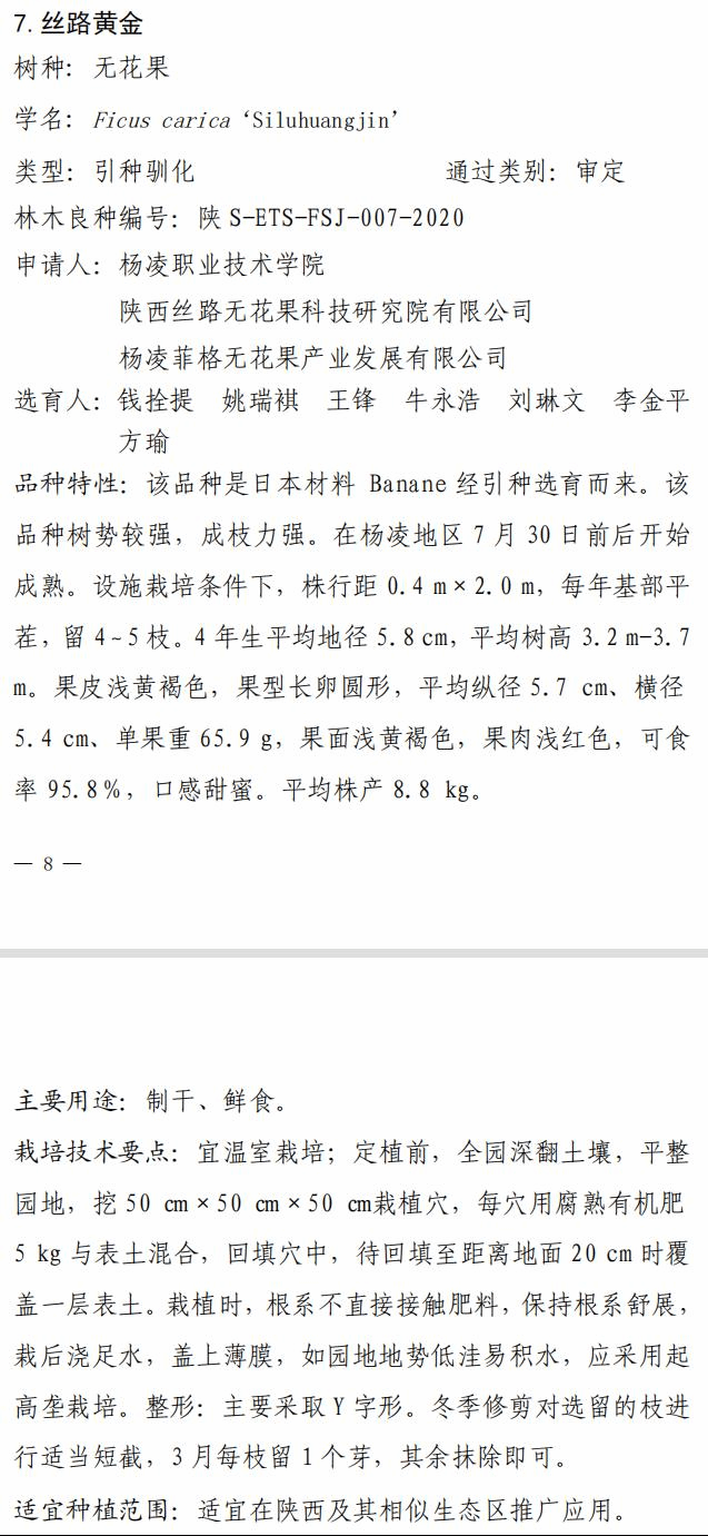 10月27日,陕西省林业局发布了2020年度陕西省林木良种名录,经陕西省林木和草品种审定委员会审定,全省共有33个品种为省级林木良种。由杨凌职业技术学院钱拴提教授团队选育的无花果新品种“丝路红玉”和“丝路黄金”通过省级林木良种审定,这是学校“双高”建设和提质培优行动计划的又一标志性成果。
