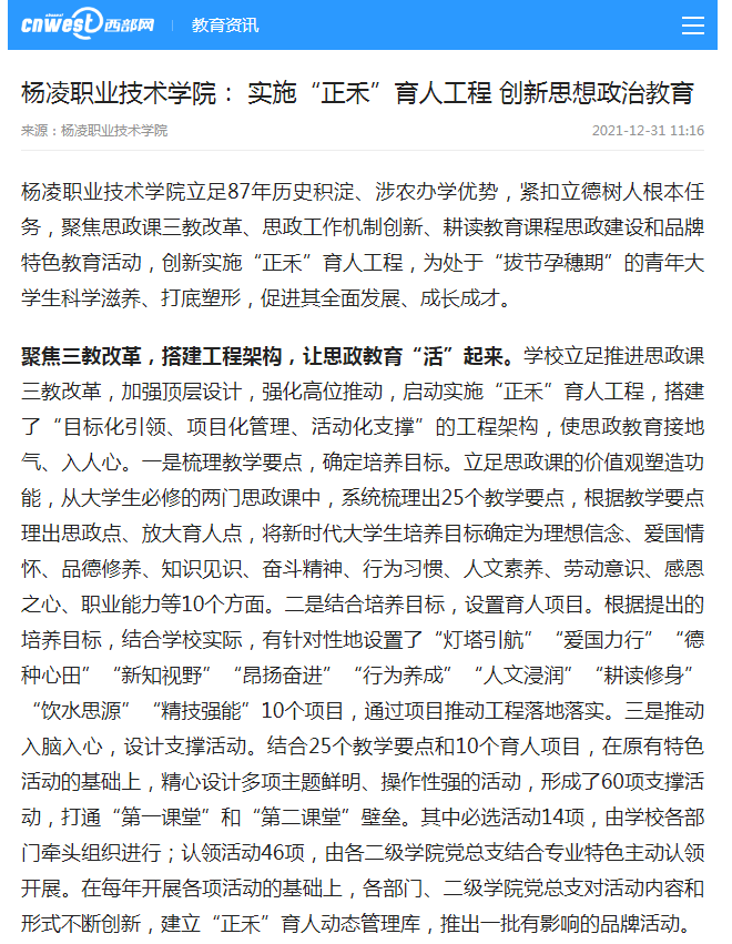 杨凌职业技术学院立足87年历史积淀、涉农办学优势,紧扣立德树人根本任务,聚焦思政课三教改革、思政工作机制创新、耕读教育课程思政建设和品牌特色教育活动,创新实施“正禾”育人工程,为处于“拔节孕穗期”的青年大学生科学滋养、打底塑形,促进其全面发展、成长成才。