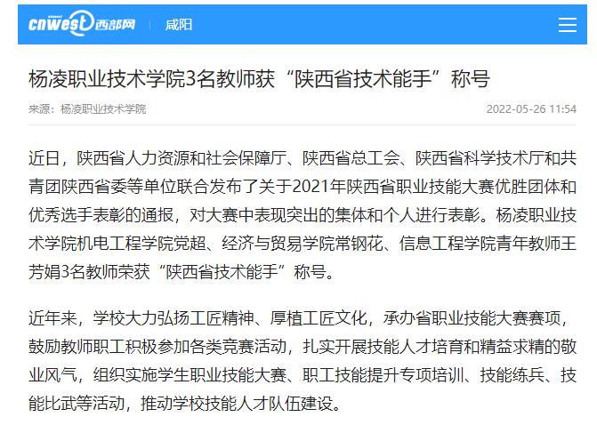 近日,陕西省人力资源和社会保障厅、陕西省总工会、陕西省科学技术厅和共青团陕西省委等单位联合发布了关于2021年陕西省职业技能大赛优胜团体和优秀选手表彰的通报,对大赛中表现突出的集体和个人进行表彰。杨凌职业技术学院机电工程学院党超、经济与贸易学院常钢花、信息工程学院青年教师王芳娟3名教师荣获“陕西省技术能手”称号。