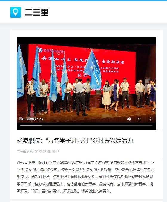 7月6日下午,杨凌职院举行2022年大学生“万名学子进万村”乡村振兴大调研暨暑期“三下乡”社会实践活动启动仪式。校长王周锁为社会实践团队授旗,党委副书记任得元主持启动仪式,党委副书记、纪委书记王勇胜作动员讲话。通过社会实践活动展现新时代杨职学子风采,努力成为理想远大、信念坚定的新青年,品德高尚、意志顽强的新青年,视野开阔、知识丰富的新青年,开拓进取、艰苦创业的新青年。