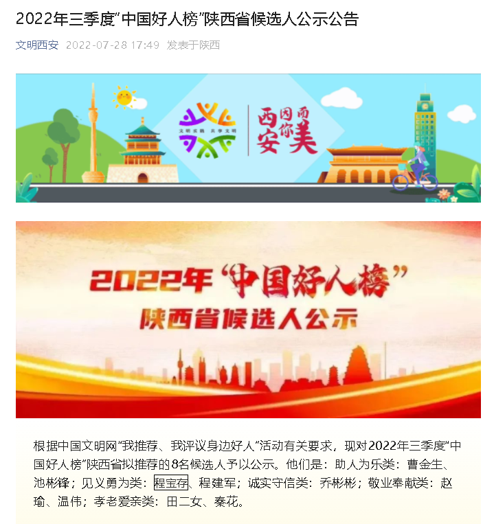 根据中国文明网“我推荐、我评议身边好人”活动有关要求,现对2022年三季度“中国好人榜”陕西省拟推荐的8名候选人予以公示。他们是:助人为乐类:曹金生、池彬锋;见义勇为类:程宝存、程建军;诚实守信类:乔彬彬;敬业奉献类:赵瑜、温伟;孝老爱亲类:田二女、秦花。