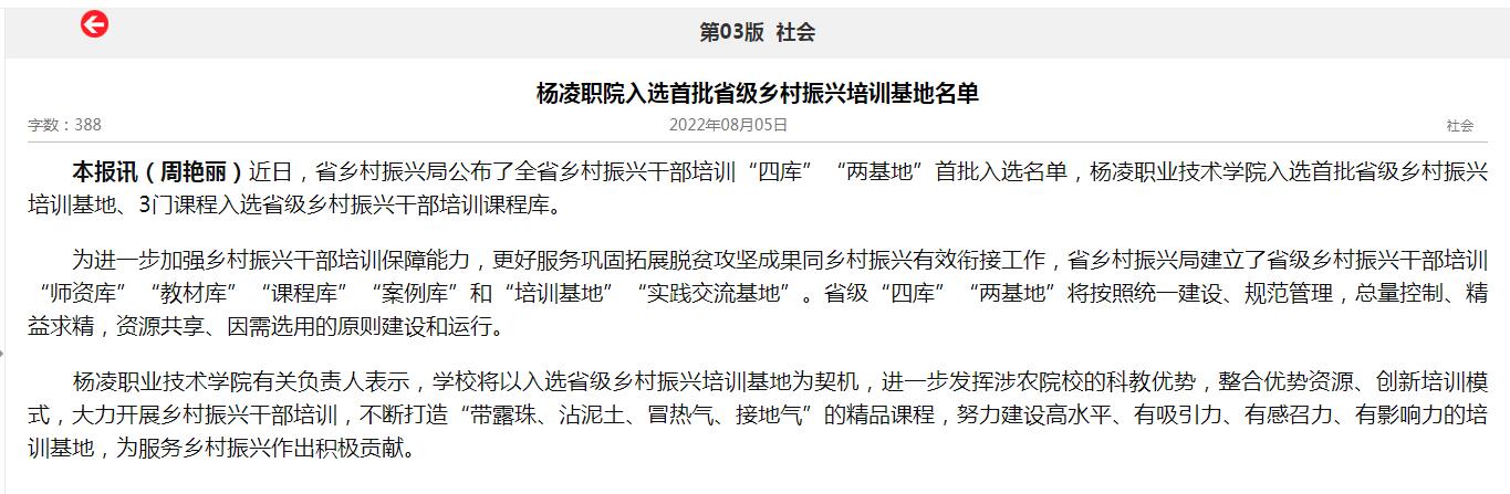 下一条:【陕西头条】杨凌职业技术学院入选陕西首批省级乡村振兴培训基地