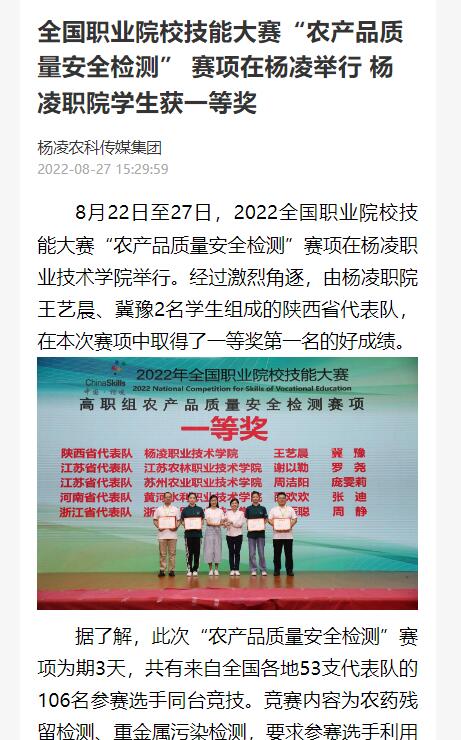 上一条:【起点新闻】喜讯!全国职业院校技能大赛“农产品质量安全检测” 赛项在杨凌举行 杨凌职院学生代表陕西队出战 斩获一等奖