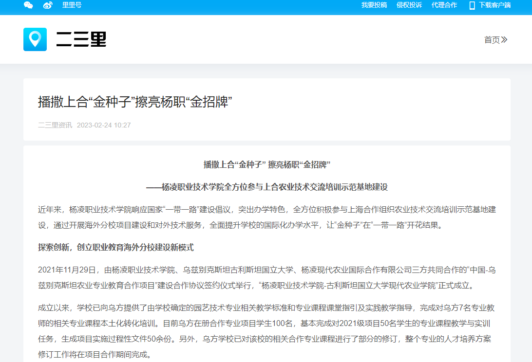近年来,杨凌职业技术学院响应国家“一带一路”建设倡议,突出办学特色,全方位积极参与上海合作组织农业技术交流培训示范基地建设,通过开展海外分校项目建设和对外技术服务,全面提升学校的国际化办学水平,让“金种子”在“一带一路”开花结果。