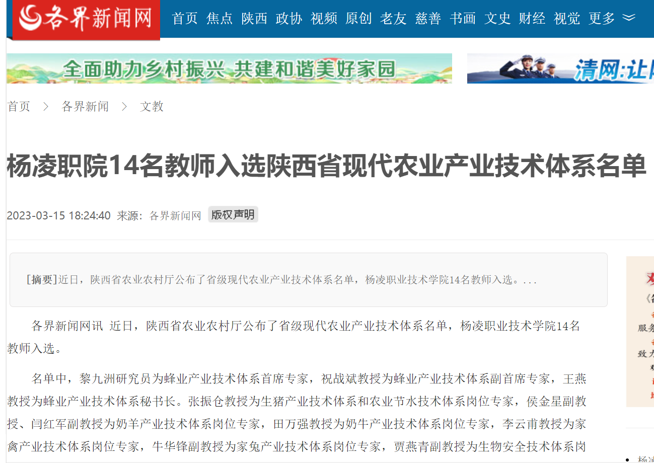 【各界新闻网】杨凌职院14名教师入选陕西省现代农业产业技术体系名单