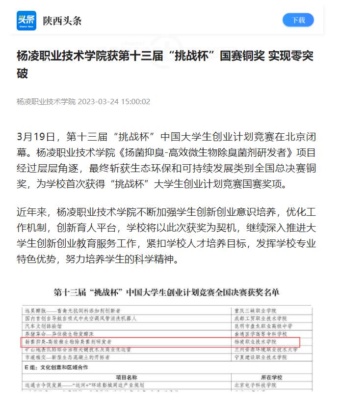 3月19日,第十三届“挑战杯”中国大学生创业计划竞赛在北京闭幕。杨凌职业技术学院《扬菌抑臭-高效微生物除臭菌剂研发者》项目经过层层角逐,最终斩获生态环保和可持续发展类别全国总决赛铜奖,为学校首次获得“挑战杯”大学生创业计划竞赛国赛奖项。