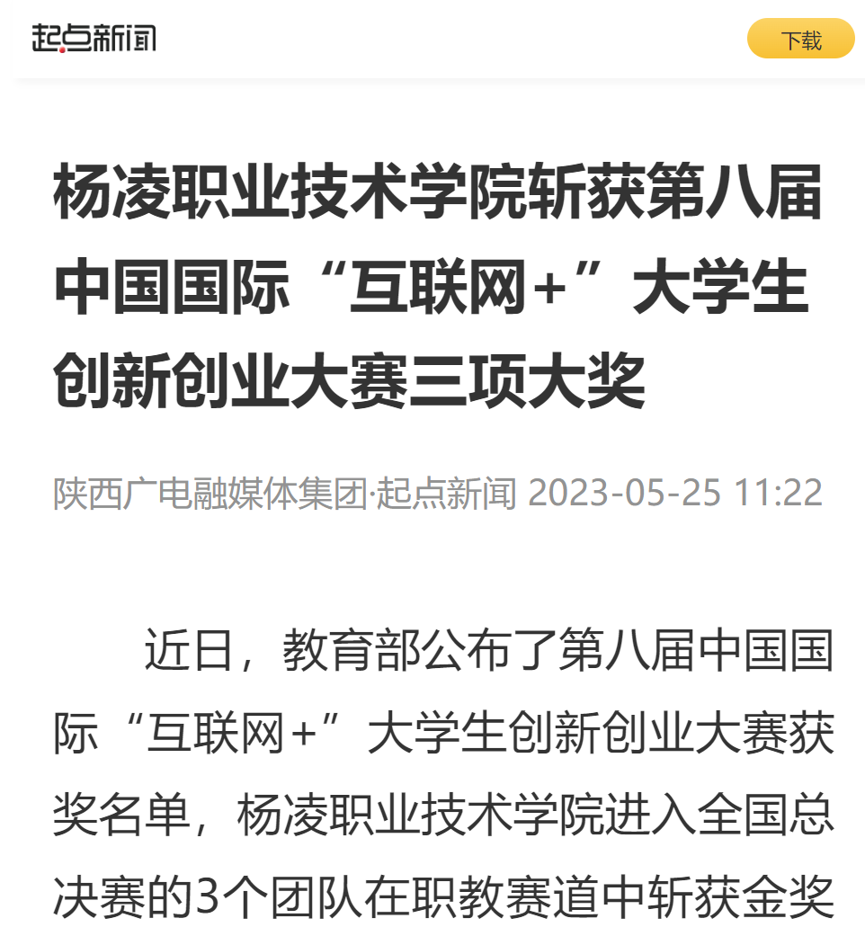 近日,教育部公布了第八届中国国际“互联网+”大学生创新创业大赛获奖名单,杨凌职业技术学院进入全国总决赛的3个团队在职教赛道中斩获金奖1项、银奖1项、铜奖1项,取得了参赛以来的最好成绩。