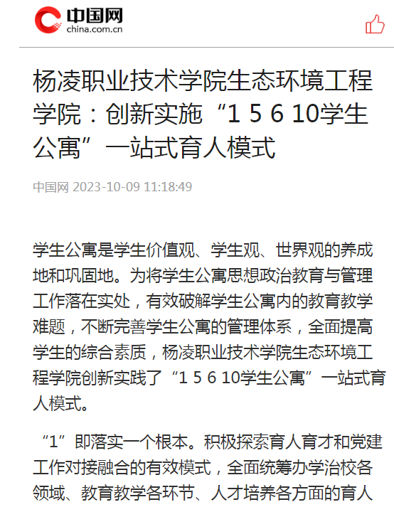 “10”即创新“十大育人”工作体系。实施党总支、党支部、共青团、学生会、学工办、教职工、劳动课、退役生、新媒体、制度赋“十进公寓”育人行动,创新了思想育人、组织育人、文化育人、朋辈育人、管理育人、专业育人、军魂育人、网络育人、劳动育人、制度育人“十大育人”工作体系,全面落实立德树人根本任务。