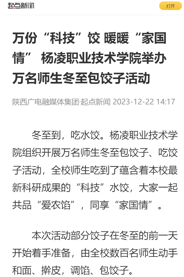 冬至到,吃水饺。杨凌职业技术学院组织开展万名师生冬至包饺子、吃饺子活动,全校师生吃到了蕴含着本校最新科研成果的“科技”水饺,大家一起共品“爱农馅”,同享“家国情”。