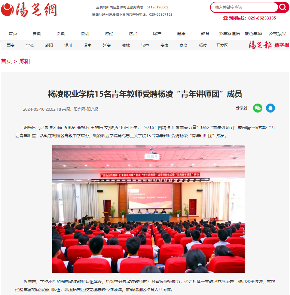 阳光讯(记者 赵小康 通讯员 曹梓若 王皓乐 文/图)5月6日下午,“弘扬五四精神 汇聚青春力量”杨凌“青年讲师团”成员聘任仪式暨“五四青年讲堂”活动在杨陵区高级中学举办,杨凌职业学院马克思主义学院15名青年教师受聘杨凌“青年讲师团”成员。