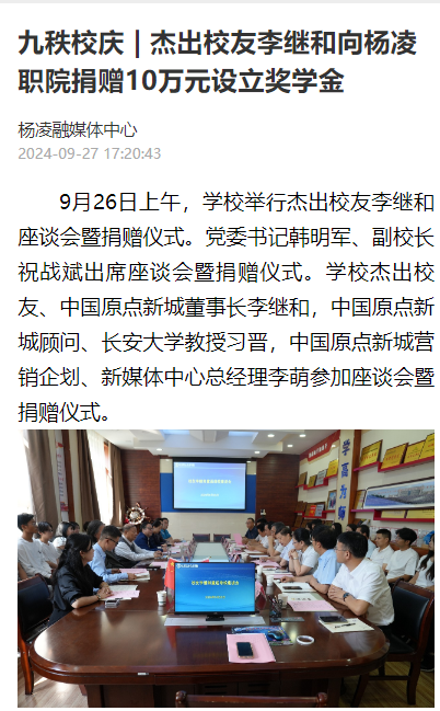 李继和是学校畜牧兽医专业毕业生,现任中国原点新城董事长、陕西省家居业商会名誉会长。为庆祝学校建校90周年,李继和特向母校捐赠人民币10万元,设立励志奖学金。