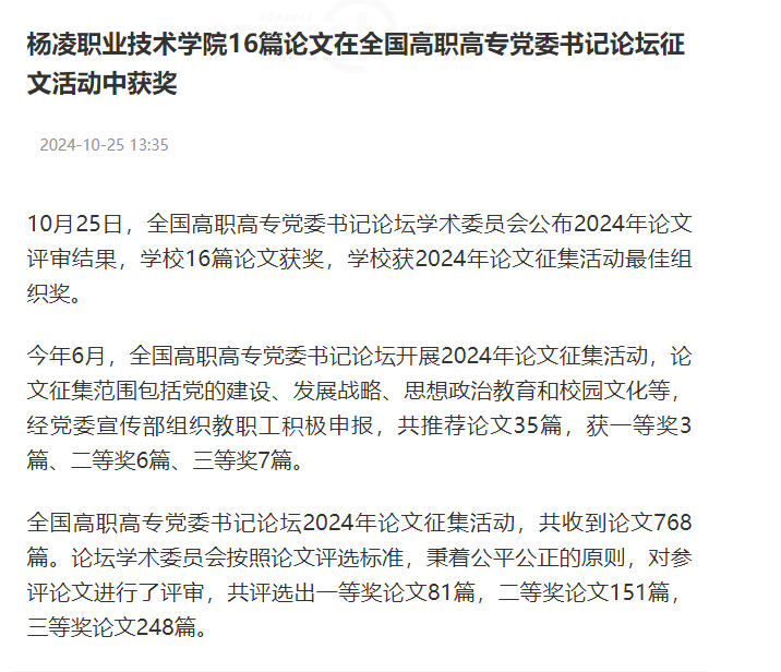 10月25日,全国高职高专党委书记论坛学术委员会公布2024年论文评审结果,学校16篇论文获奖,学校获2024年论文征集活动最佳组织奖。