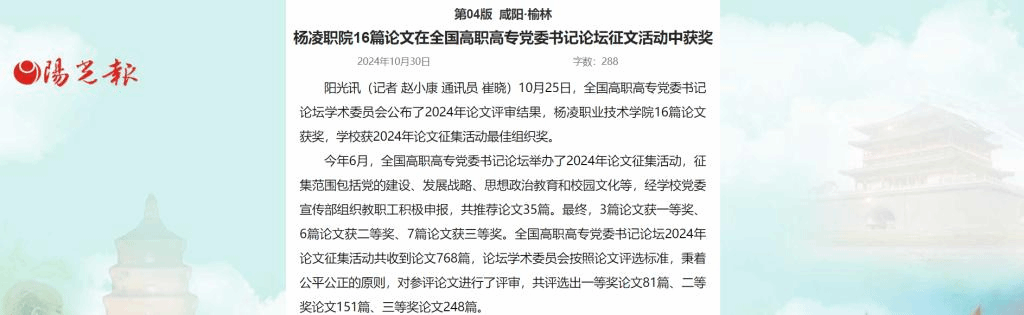 阳光讯(记者 赵小康 通讯员 崔晓)10月25日,全国高职高专党委书记论坛学术委员会公布了2024年论文评审结果,杨凌职业技术学院16篇论文获奖,学校获2024年论文征集活动最佳组织奖。