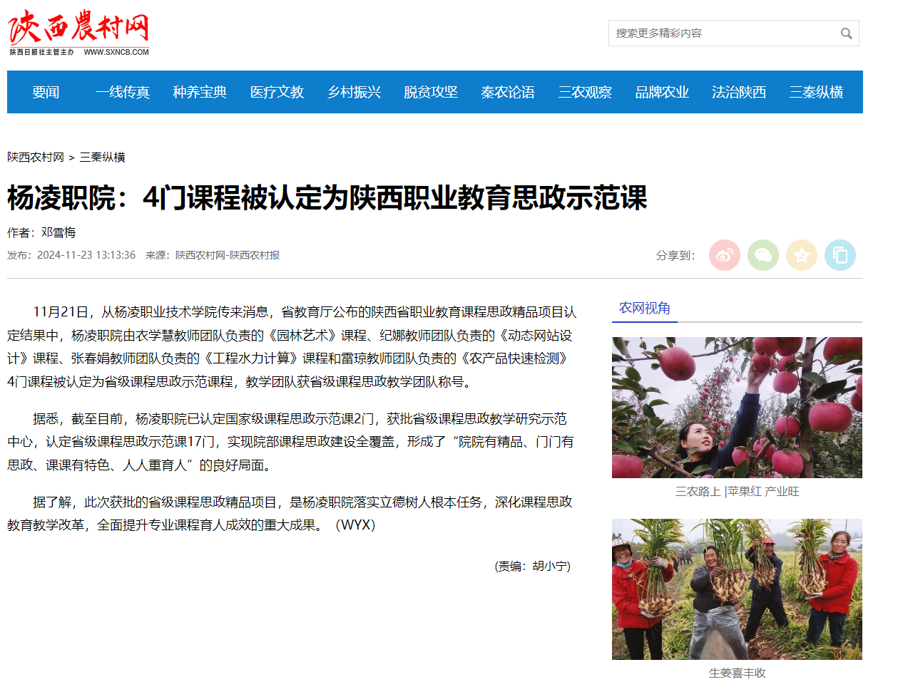 11月21日,从杨凌职业技术学院传来消息,省教育厅公布的陕西省职业教育课程思政精品项目认定结果中,杨凌职院由衣学慧教师团队负责的《园林艺术》课程、纪娜教师团队负责的《动态网站设计》课程、张春娟教师团队负责的《工程水力计算》课程和雷琼教师团队负责的《农产品快速检测》4门课程被认定为省级课程思政示范课程,教学团队获省级课程思政教学团队称号。