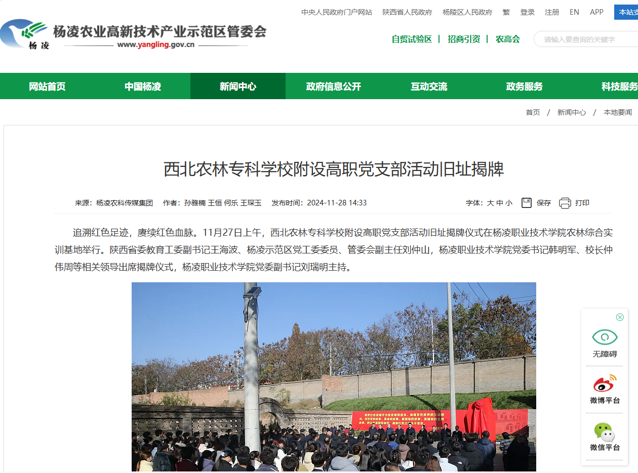 追溯红色足迹,赓续红色血脉。11月27日上午,西北农林专科学校附设高职党支部活动旧址揭牌仪式在杨凌职业技术学院农林综合实训基地举行。陕西省委教育工委副书记王海波、杨凌示范区党工委委员、管委会副主任刘仲山,杨凌职业技术学院党委书记韩明军、校长仲伟周等相关领导出席揭牌仪式,杨凌职业技术学院党委副书记刘瑞明主持。