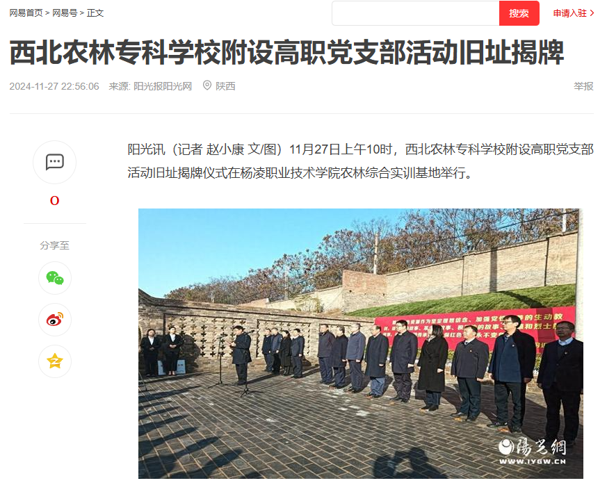 阳光讯(记者 赵小康 文/图)11月27日上午10时,西北农林专科学校附设高职党支部活动旧址揭牌仪式在杨凌职业技术学院农林综合实训基地举行。