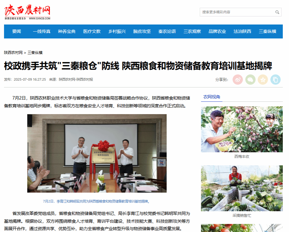 7月2日,陕西农林职业技术大学与省粮食和物资储备局签署战略合作协议,陕西省粮食和物资储备教育培训基地同步揭牌,标志着双方在粮食安全人才培育、科技创新等领域的深度合作正式启动。