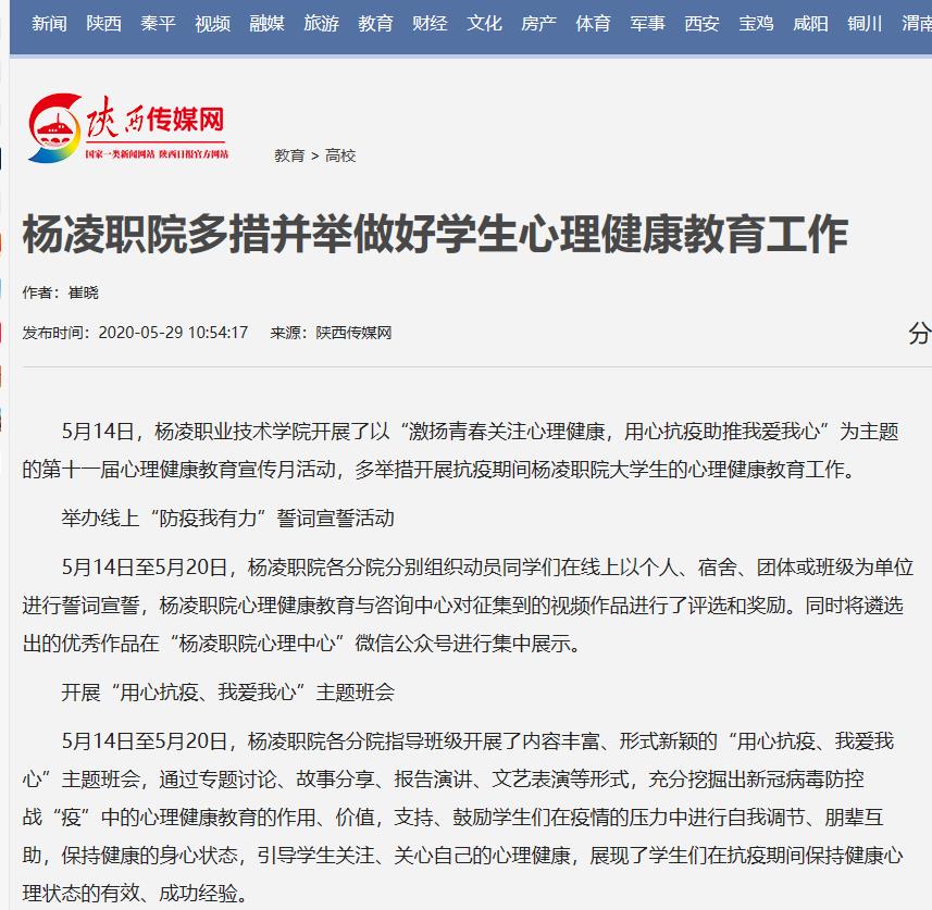 5月14日至5月20日,杨凌职院各分院指导班级开展了内容丰富、形式新颖的“用心抗疫、我爱我心”主题班会,通过专题讨论、故事分享、报告演讲、文艺表演等形式,充分挖掘出新冠病毒防控战“疫”中的心理健康教育的作用、价值,支持、鼓励学生们在疫情的压力中进行自我调节、朋辈互助,保持健康的身心状态,引导学生关注、关心自己的心理健康,展现了学生们在抗疫期间保持健康心理状态的有效、成功经验。