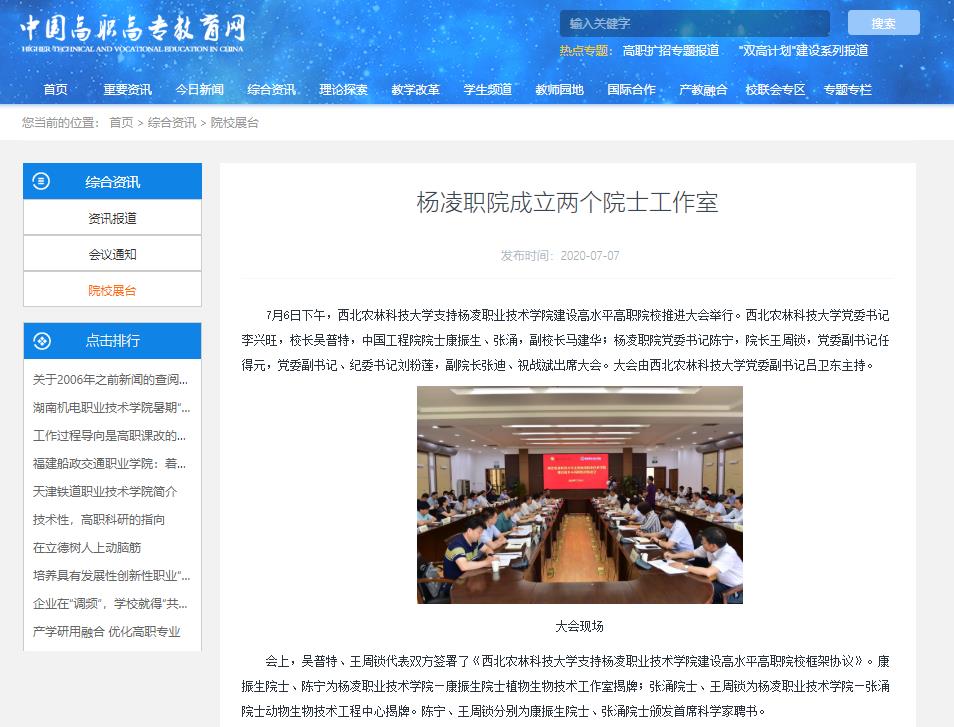 7月6日下午,西北农林科技大学支持杨凌职业技术学院建设高水平高职院校推进大会举行。西北农林科技大学党委书记李兴旺,校长吴普特,中国工程院院士康振生、张涌,副校长马建华;杨凌职院党委书记陈宁,院长王周锁,党委副书记任得元,党委副书记、纪委书记刘粉莲,副院长张迪、祝战斌出席大会。大会由西北农林科技大学党委副书记吕卫东主持。
