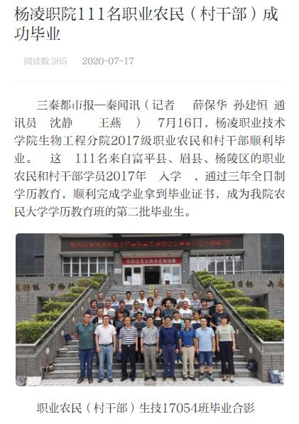 三秦都市报—秦闻讯(记者 薛保华 孙建恒 通讯员 沈静 王燕 ) 7月16日,杨凌职业技术学院生物工程分院2017级职业农民和村干部顺利毕业。 这 111名来自富平县、眉县、杨陵区的职业农民和村干部学员2017年 入学 ,通过三年全日制学历教育,顺利完成学业拿到毕业证书,成为我院农民大学学历教育班的第二批毕业生。