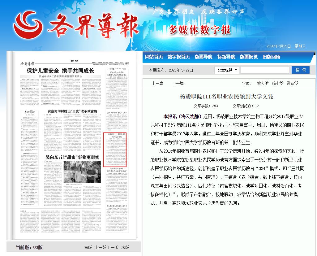 本报讯(海云沈静)近日,杨凌职业技术学院生物工程分院2017级职业农民和村干部学历班111名学员顺利毕业。这些来自富平、眉县、杨陵区的职业农民和村干部学员2017年入学,通过三年全日制学历教育,顺利完成学业并拿到毕业证书,成为学院农民大学学历教育班的第二批毕业生。 从2016年招收首届职业农民和村干部学历班开始,经过4年的探索和实践,杨凌职业技术学院在新型职业农民学历教育方面探索出了一条乡村干部和新型职业农民学历培养的新途径,创新构建了职业农民学历教育“334”模式,即“三共同(共同招生、共订方案、共同管理)、三结合(农学结合、线上线下结合、校内课堂与田间地头结合)、四化特征(内容模块化、教学项目化、教材活页化、考核多样化)”,形成了产教融合、校地联动、农学结合的新型职业农民培养模式,开启了高职领域职业农民学历教育的先河。
