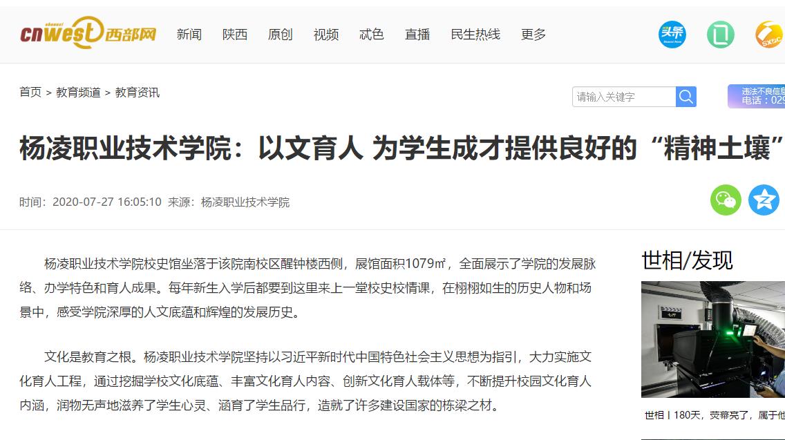 为丰富校园文化育人内涵、增强校园文化育人实效,杨凌职业技术学院还将文化育人与师德师风建设相结合,培育具备“学高身正”的教师文化。开展师德标兵“讲报告”、教师“学习政治理论”、教师“做学生楷模”和评选师德先进典型活动,构建“讲、学、做、评”四位一体师德建设体系,使教师成为校园文化的引领者、传承者;与专业建设发展相结合,培育富有“工匠精神”的专业文化。根据专业特点,深入挖掘各专门课程所蕴含的德育元素,并通过设立院士工作室、聘任行业技能大师,积极搭建“工匠精神”培育的平台;与思政课堂教学相结合,培育充满“趣味魅力”的课堂文化。深入推进思政课信息化建设和线上线下混合式教学,探索思政课“三环联动”教学模式,不断提升教学实效性和学生获得感;与学生实践活动相结合,培育蕴含“家国情怀”的实践文化。在专业实训、课外活动、顶岗实习、社会实践、技能竞赛、志愿服务等活动中融入文化育人元素,使学生在实践中深化爱国、荣校的认知。