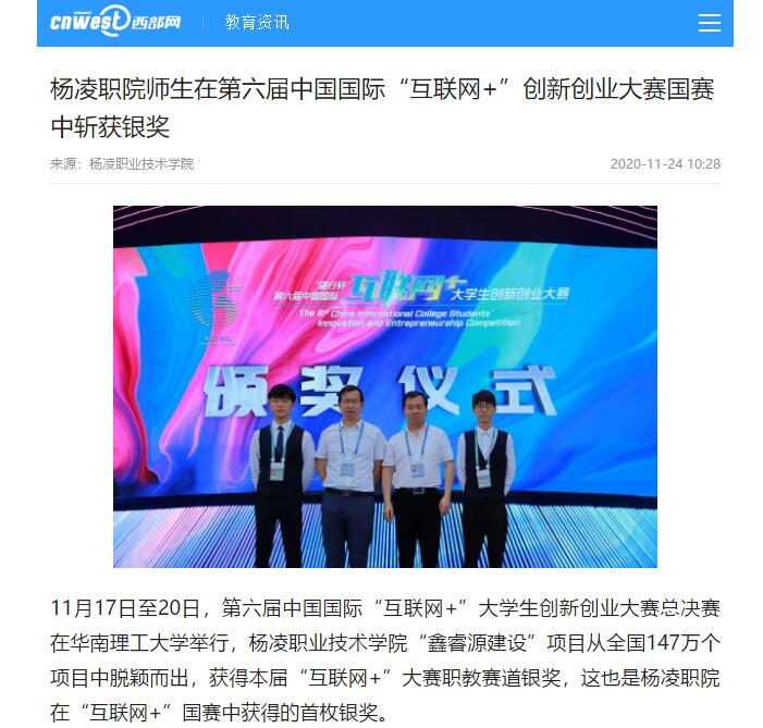 11月17日至20日,第六届中国国际“互联网+”大学生创新创业大赛总决赛在华南理工大学举行,杨凌职业技术学院“鑫睿源建设”项目从全国147万个项目中脱颖而出,获得本届“互联网+”大赛职教赛道银奖,这也是杨凌职院在“互联网+”国赛中获得的首枚银奖。