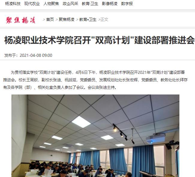 为贯彻落实学校"双高计划"建设任务,4月6日下午,杨凌职业技术学院召开2021年"双高计划"建设部署推进会。校长王周锁,副校长张迪、祝战斌,党委委员、发展规划处处长张宏辉,党委委员、教务处处长拜存有及各学院(部)、相关处室负责人参加了会议。会议由张迪主持。